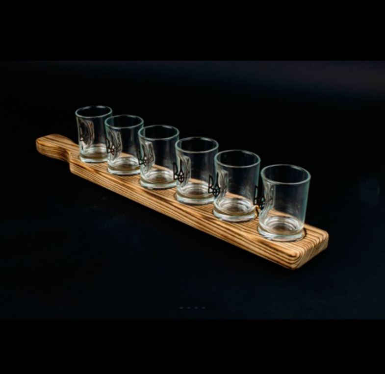 Тризуб в чарці. Ціна вказана на набір 6 шт чарок на дерев'яній підставці.