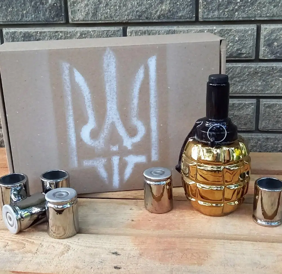 Пляшка у вигляді гранати Ф1, чарочки виконані у вигляді гільз. Це чудовий подарунковий набір для офіцера, солдата, військового або просто чоловікові. Набір укомплектований у гарну коробочку з дерев'яним наповнювачем та прінтом Герб України, що додасть ексклюзиву на подарунок.